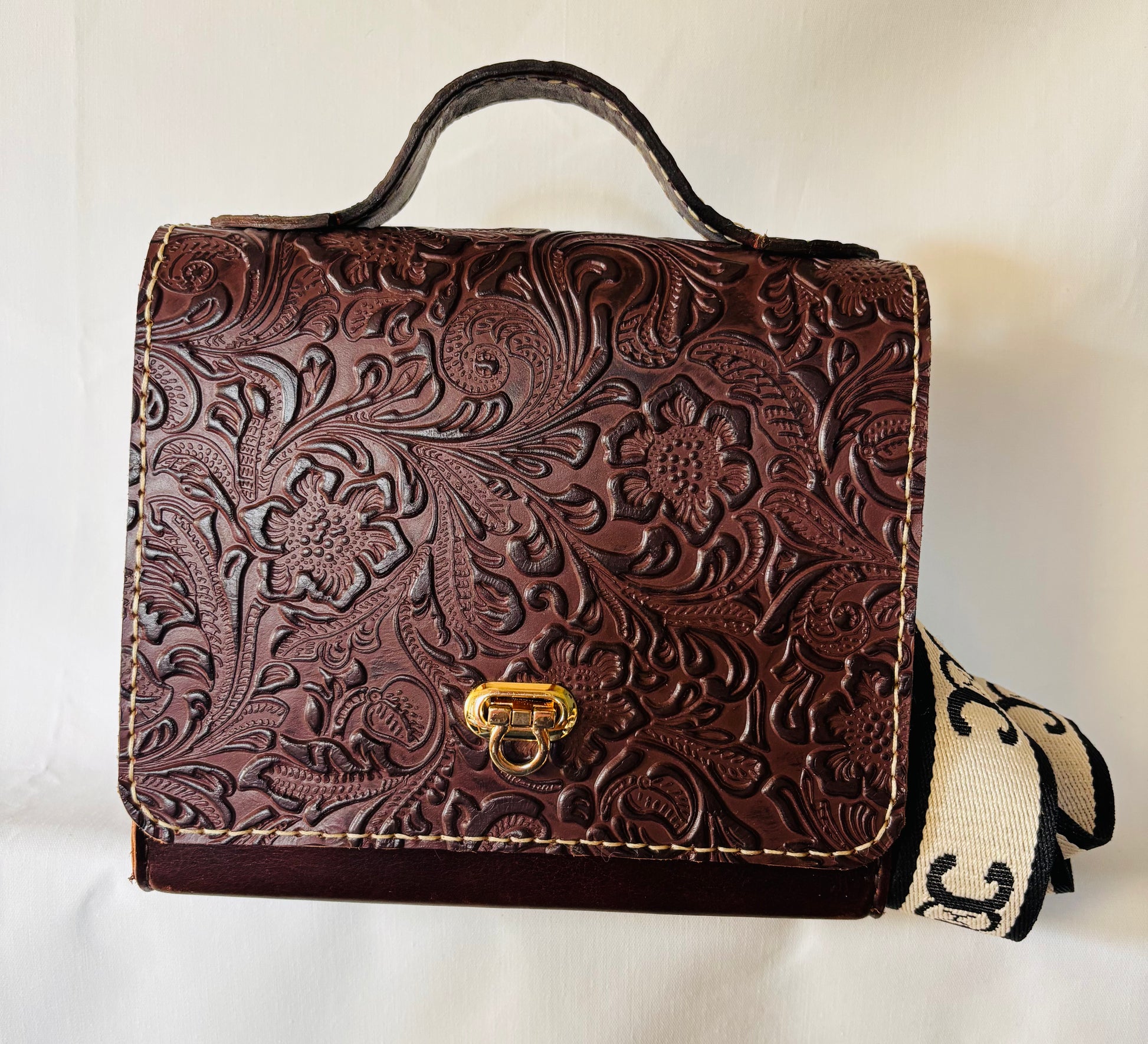 Crafted from premium Italian calfskin sourced from one of Italy's finest tanneries, this crossbody showcases an exquisite charro flower pattern. The versatile silhouette transitions seamlessly from day to evening, offering generous capacity without compromising elegance. A soft suede interior with secure zip pocket keeps essentials organized. Dimensions: 20 x 20 x 10 cm.